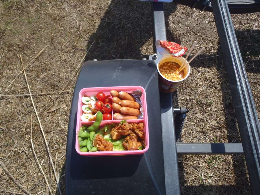 *お昼にはお客さんの奥さんが作った惣菜と暖かいカップ麺を