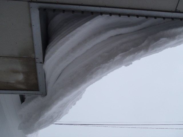 屋根の下から見ると、大量の積もった雪が何時落ちてきても 不思議じゃない状況です。