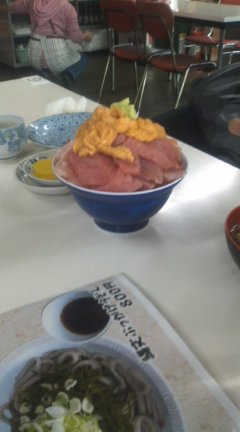 昨日のお昼にお客さんとご飯を食べに行くことになり、浅虫方面へ車を走らせ、一軒の食堂へ…。天気も悪かったのですが何故か人が沢山いて、店の外側で待つことに。自分達の順番になり店に入ってみると、納得しました。なんで混んでいるか。こんな丼が。豪快でしかも美味しかったです。