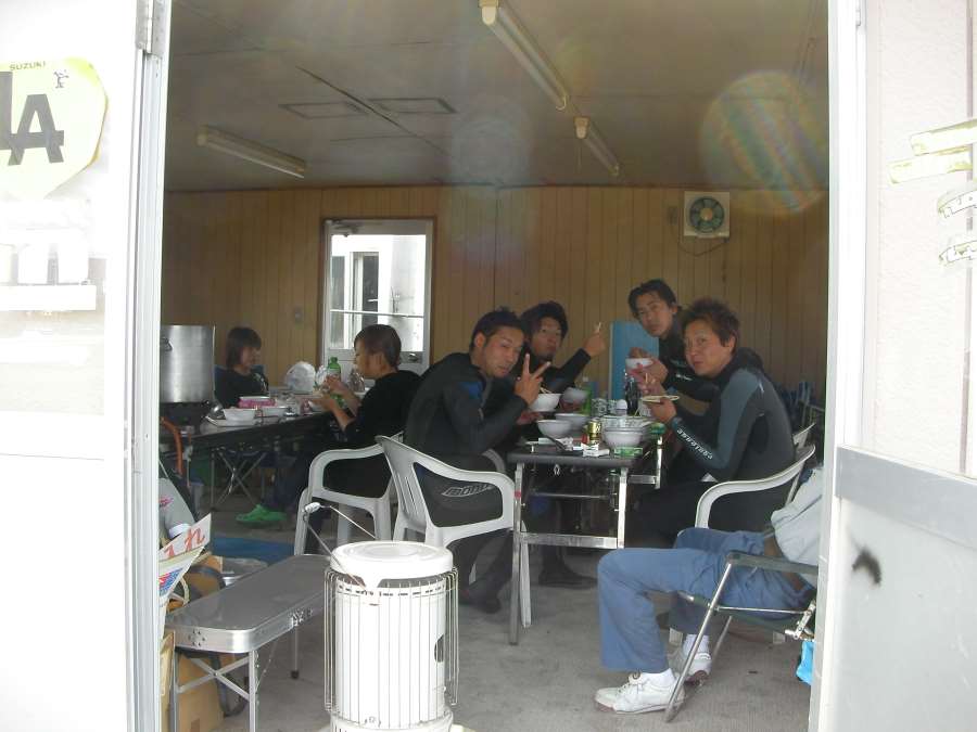 うちのお客さんもジェットに乗るときにはほとんどセミドライスーツ が必須な季節ですが、今日はストーブに煮込みうどんまでの3点セット でした。