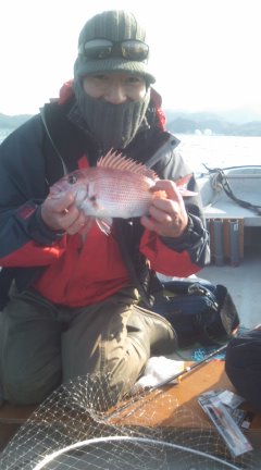 今日の朝6時から三人で鯛釣りへ…。初めてのまなぶ君がビギナーズラックでゲット。