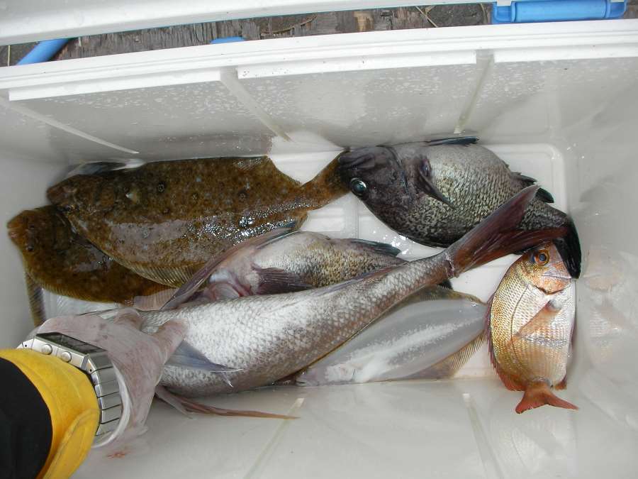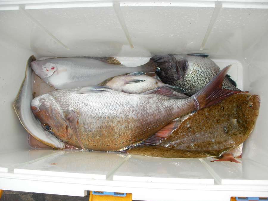 初めて鯛を釣り上げました。 クーラーに入っている後の魚はお客さんが釣った物ですw