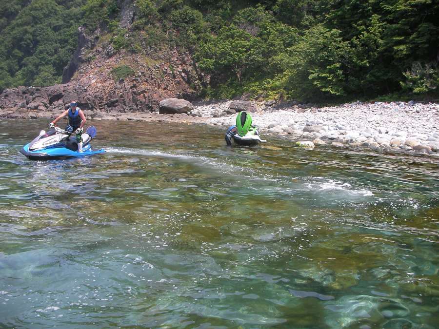 予定では材木岩(漁港)へ向かう事に! 最初は走る距離も考えて、真直ぐの方向に向かう事に。 風も波も無く、スタンドアップでも問題なく走れるコンディションデ、みんな笑顔で走行していました。 約15分くらいでむつ方面へ到着! その場でみんなでJETから降りて初むつに1歩踏み入れ!!あまり人が入れるようなところじゃないので、海も綺麗で魚も沢山泳いでいたし、水も綺麗で底が見えているほどでした。