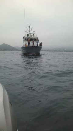 今日は朝から釣りをしていると魚は全く引きをみせないのですが、何故か保安庁さんがちかずいてきて、免許証と書類のチェックを受けました。写真は船が近づいてきている所の一枚